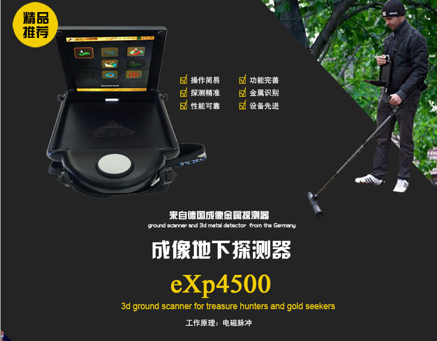 您是否不滿足于只在地表附近搜索小價值的物件?您是否希望探測到普通金屬探測器不能探測到的埋得更深的真正寶藏?OKM公司向您推薦eXp 4500多功能地下影像探測器和地面掃描儀。eXp 4500為尋寶者和勘探者而制造,您只需要拿起eXp 4500就可以找到那些埋藏的寶藏。這正是您想做的。